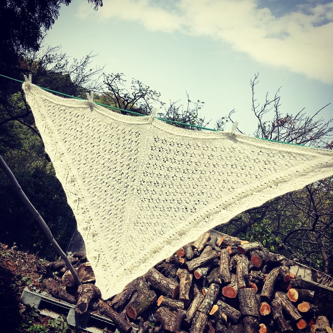 前回の大判三角ショールの小型版、こちらも極細のアルパカスーリー糸で編みました。とても軽く、アルパカのぬめり感が心地よい。少し肌寒いこともある、春先にさっと羽織れる一品。