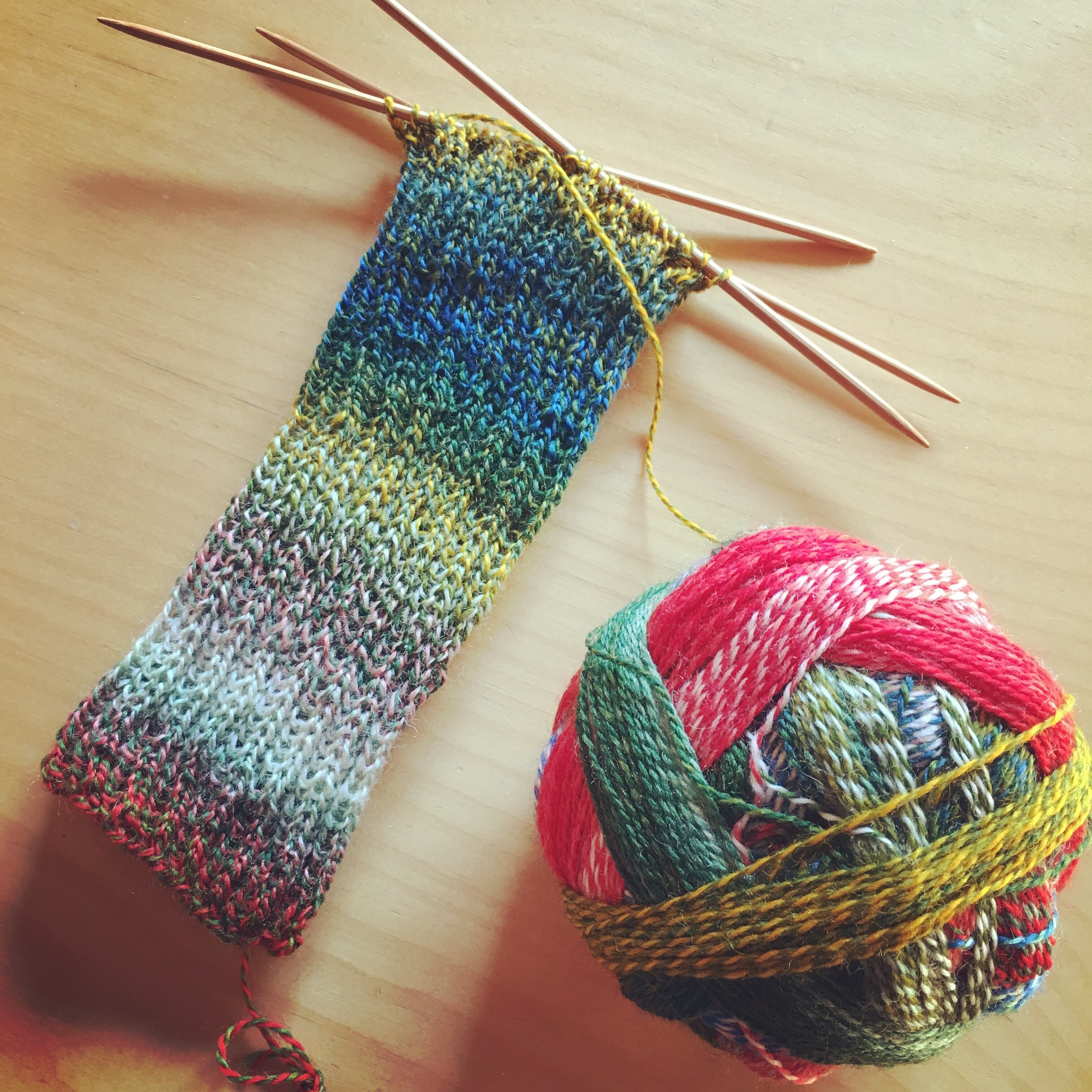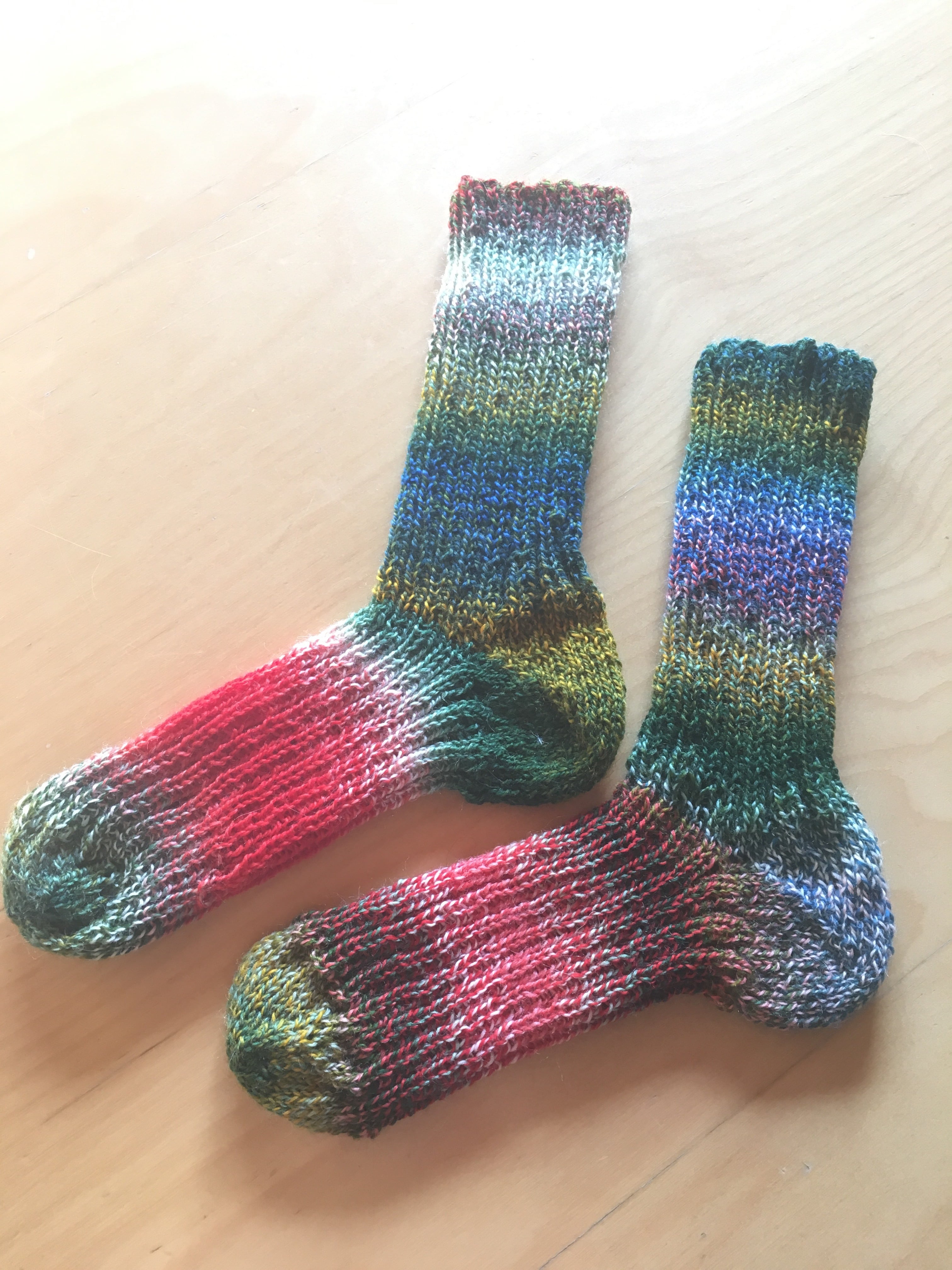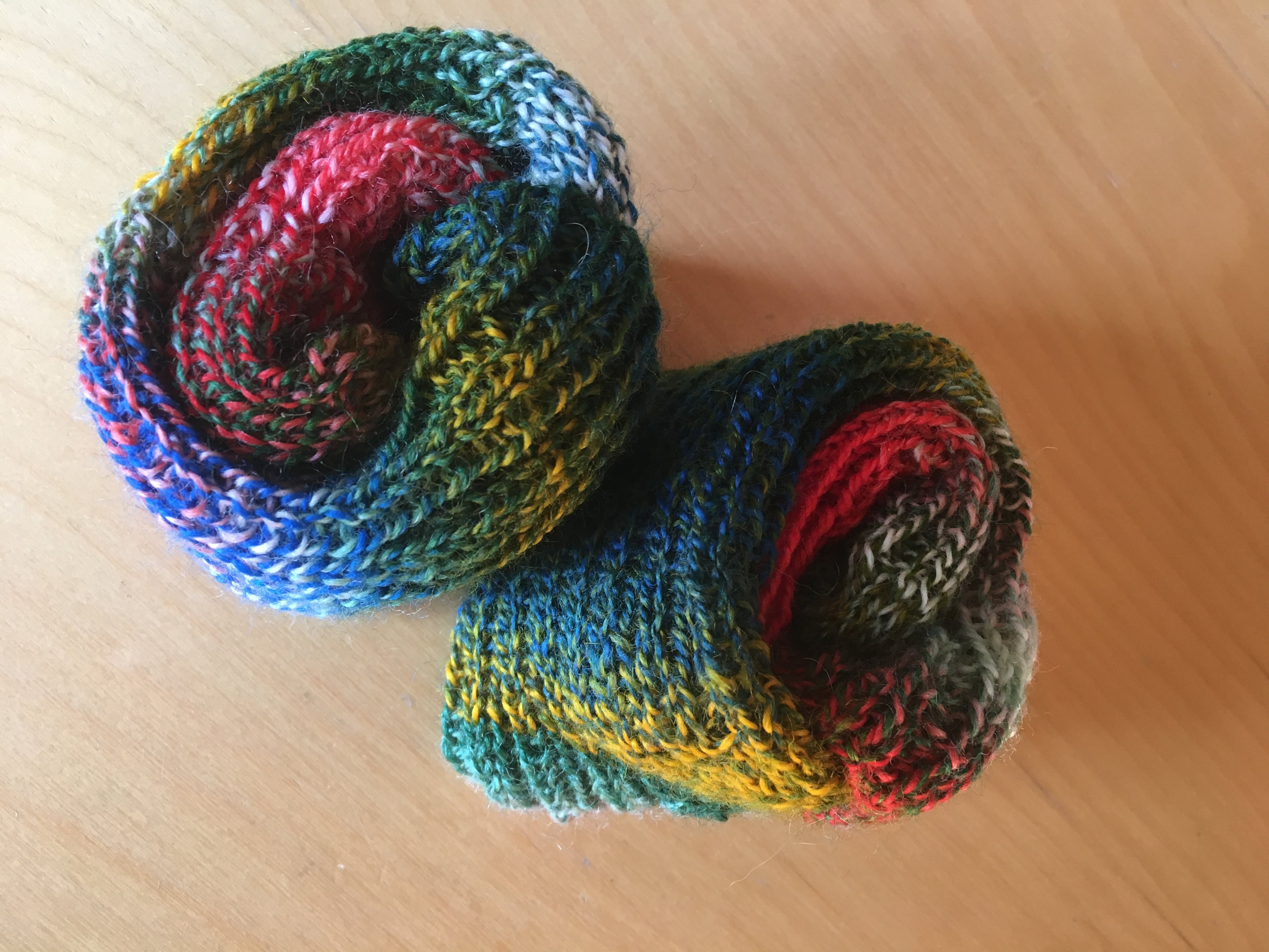 とてもカラフルなグラデーションのドイツ製の毛糸で編みました。