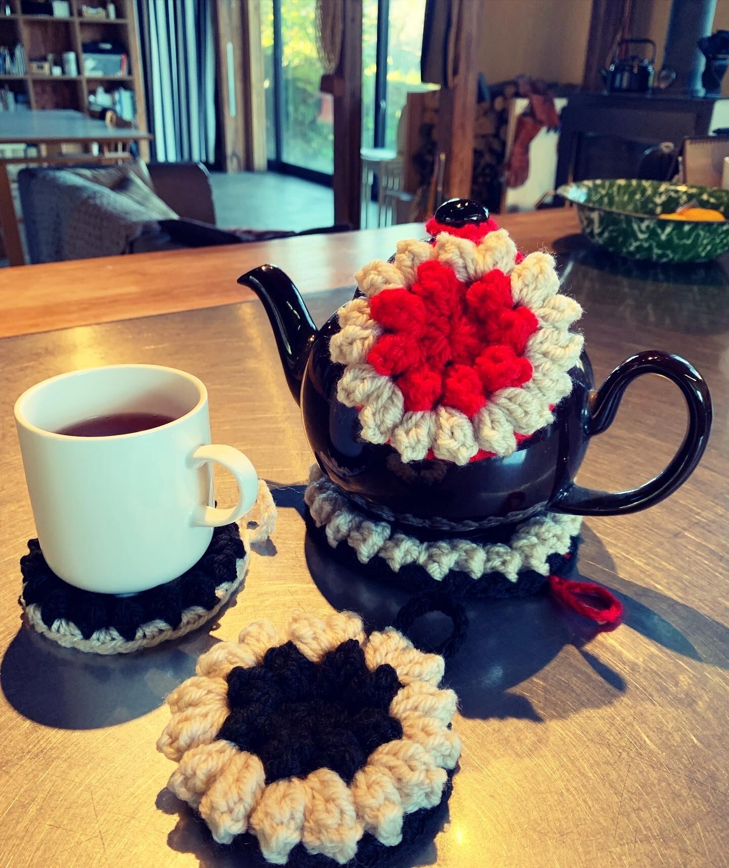 アクリル毛糸で編んだオシャレ鍋つかみです。熱いオーブン皿などの取り扱いには不向きです。ご了承下さい。